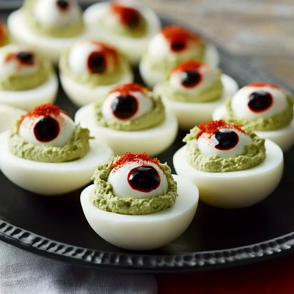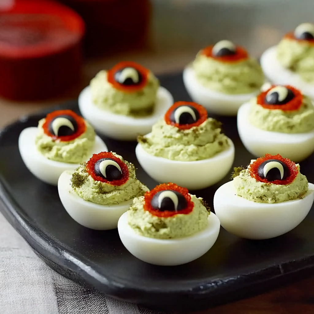 Get ready to impress your guests this Halloween with these Creepy Eyeball Deviled Eggs! This fun twist on a classic appetizer features perfectly boiled eggs filled with a creamy yolk mixture, topped with black olives to resemble eerie eyeballs. With just a touch of red food coloring or sriracha for the “blood” effect, these spooky snacks are sure to be a hit at any Halloween gathering. Quick to prepare and delightfully creepy in presentation, they offer a playful way to add some frightful flair to your festive spread. Ideal as appetizers or part of a themed buffet, these deviled eggs are not only visually striking but also deliciously addictive!